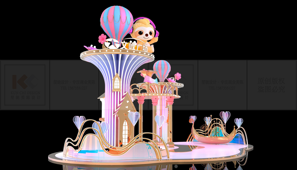 ●主景是音樂森林的中心,飛舞的熱氣 球帶著奇妙的夢幻花朵正要起航,文 文迎接到訪的人們。還有美麗的音樂 船吹響著號角,慶祝節(jié)日的來臨。。